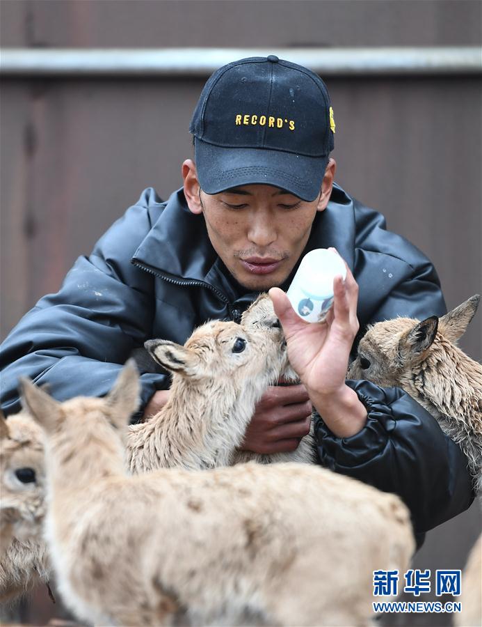 7月8日,三江源國(guó)家公園管理局長(zhǎng)江源園區(qū)可可西里管理處卓乃湖保護(hù)站的工作人員才文多杰在給一只藏羚羊幼仔喂奶。新華社記者 張龍 攝