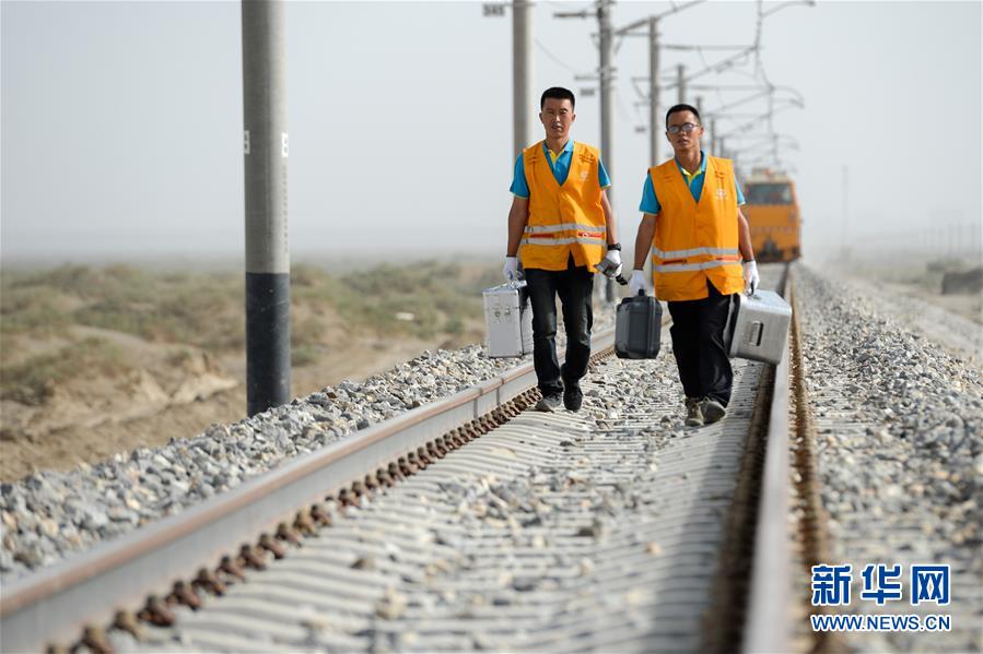 鋼軌打磨機組的技術(shù)員拎著重達20公斤的設(shè)備前往下一個檢測點(7月14日攝)。新華社記者 丁磊 攝