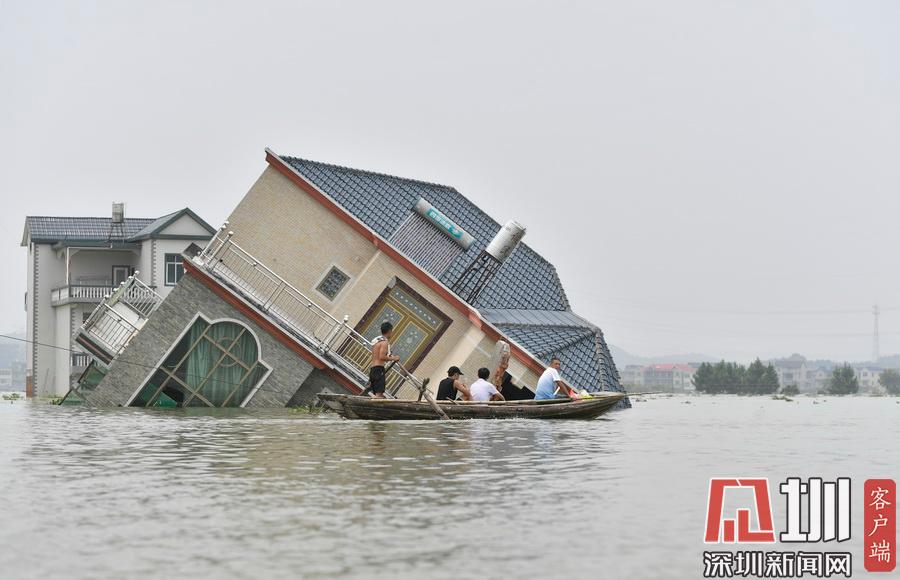 2020年7月15日,江西省鄱陽縣油墩街鎮(zhèn)同興村,村莊受到洪水圍困,大部分村民已經(jīng)被轉(zhuǎn)移出去,仍有少數(shù)村民選擇留守家中積極自救繼續(xù)生活。7月8日晚,鄱陽縣油墩街鎮(zhèn)西江因特大暴雨出現(xiàn)漫堤決口,5個(gè)行政村被洪水圍困,數(shù)萬名群眾被及時(shí)疏散轉(zhuǎn)移。同興村村民張瑤康回憶起了當(dāng)時(shí)的場景,“水一下子就涌進(jìn)來,等緩過神來趕緊向二樓轉(zhuǎn)移一樓的物品。洪水來時(shí)只從一樓搶到了一些輕便易拿的東西,冰箱、洗衣機(jī)之類的大物件,至今仍浸泡在一樓水中。”15日,記者跟隨張瑤康乘船回家,抵達(dá)后看到,一樓淹沒在水中,一個(gè)綁在二樓護(hù)欄的木梯成為進(jìn)出“家門”的唯一通道?!懊刻靹澊ゴ謇镞\(yùn)送水和食物,家里有煤氣罐和灶臺(tái)。因?yàn)?0多歲的老母親行動(dòng)不便,我們選擇留守家中?!薄半m然對(duì)岸就有安置點(diǎn),但還是更愿待在自己家里,一來是不愿意給政府添麻煩,二來能每天看著自己的房子心里踏實(shí)。”同興村村民張長來夫婦帶著剛剛領(lǐng)到的大米、方便面、飲用水乘船回到家中。記者在現(xiàn)場看到,隨著各方救援力量和物資的匯聚,被洪水圍困的村民生活雖有不便,但生活仍在繼續(xù)?!胺孔硬坏梗揖驮?,我們要積極面對(duì),早日重建家園?!睆埇幙蹈嬖V記者。