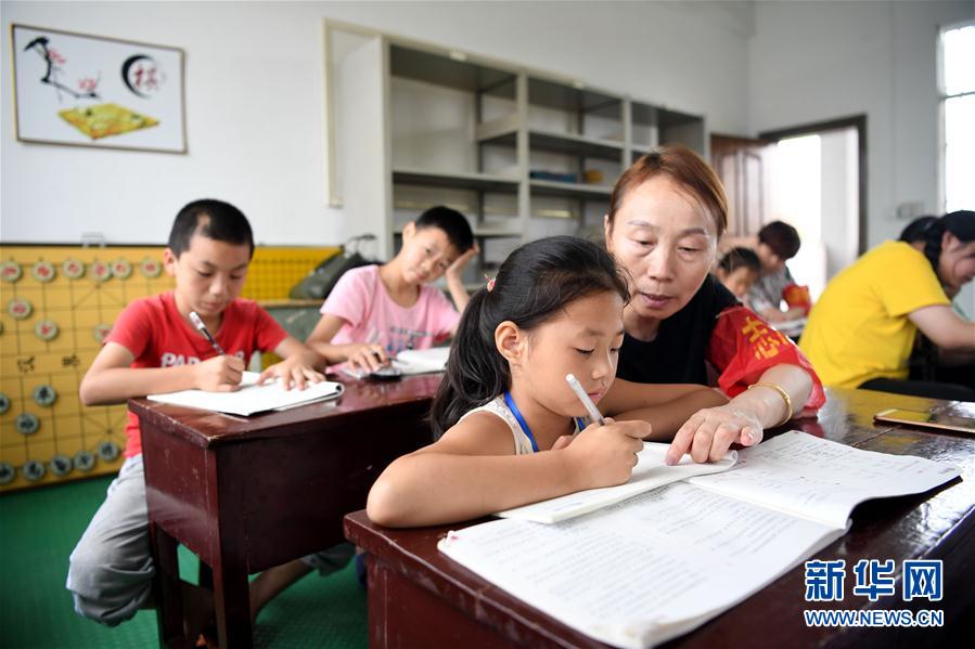 7月16日,在安徽省宿松縣洲頭鄉(xiāng)中心小學集中安置點,教師志愿者輔導孩子們完成暑假作業(yè)。