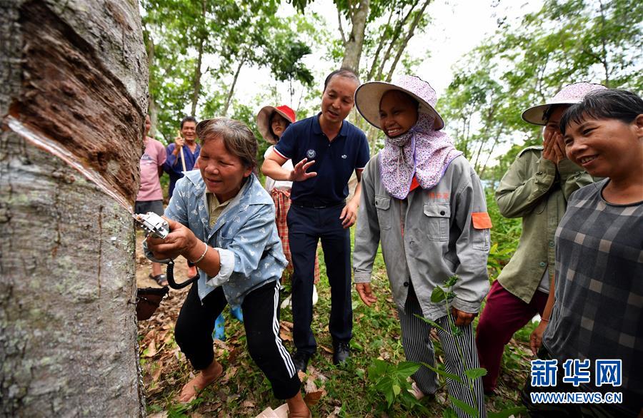 7月15日,瓊中縣什運(yùn)鄉(xiāng)便文村貧困戶在技術(shù)人員指導(dǎo)下試用電動割膠刀。當(dāng)日,海南瓊中黎族苗族自治縣什運(yùn)鄉(xiāng)為542名貧困戶免費(fèi)發(fā)放電動割膠刀,割膠刀研發(fā)單位為貧困戶提供使用技能培訓(xùn)。海南有著豐富的天然橡膠資源,但傳統(tǒng)膠刀的割膠技術(shù)要求高,農(nóng)民難以掌握,許多膠林閑置。電動割膠刀使割膠簡單易學(xué),幫助村民提高割膠效率,助力脫貧增收。新華社記者郭程攝