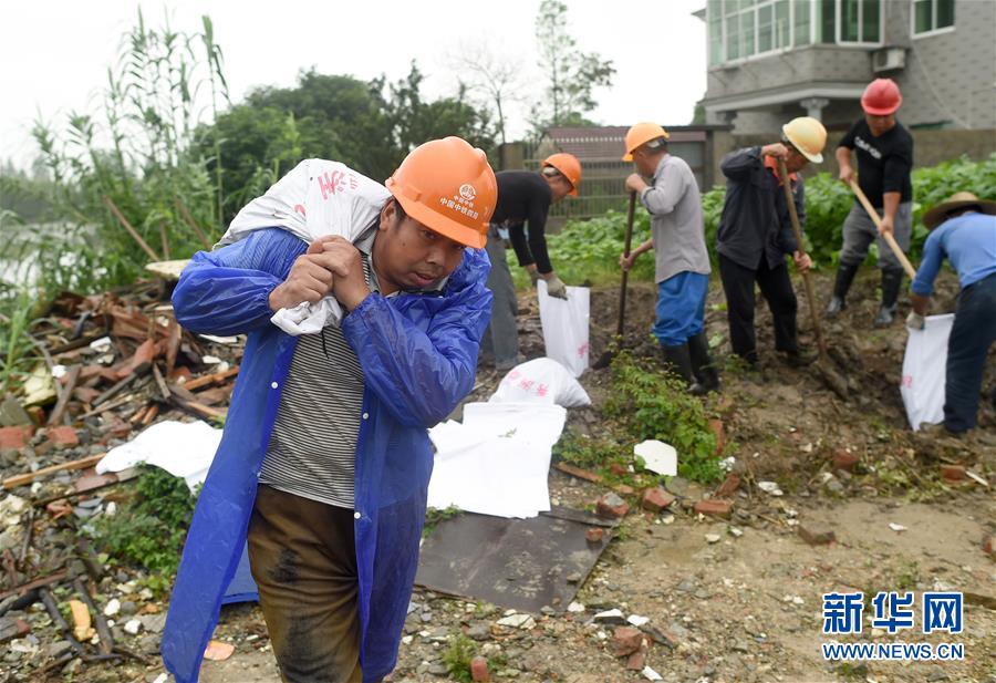 7月17日,防汛人員在秀洲區(qū)新塍鎮(zhèn)小金港村的河道邊加高堤防。浙江省嘉興市秀洲區(qū)處在杭嘉湖平原,受持續(xù)強降雨及上游排水影響,近期,秀洲區(qū)境內(nèi)的京杭大運河分支航道持續(xù)保持較高水位。當(dāng)?shù)叵嚓P(guān)部門嚴(yán)陣以待,落實各項措施,確保安全度汛。新華社記者韓傳號攝