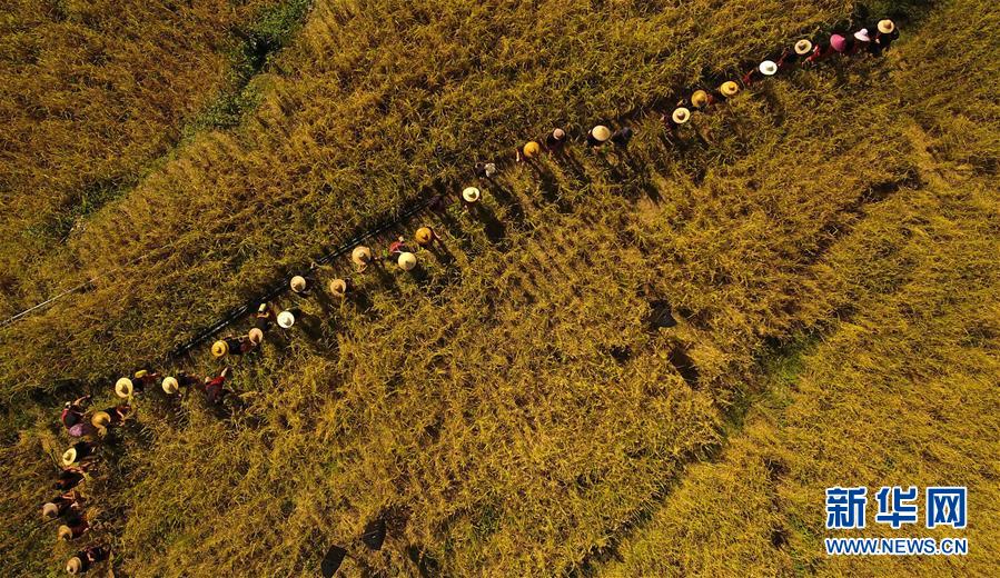 村民在海南省白沙黎族自治縣青松鄉(xiāng)擁處村的山蘭稻田內(nèi)收割山蘭稻(2019年11月17日,無人機照片)。新華社記者楊冠宇攝