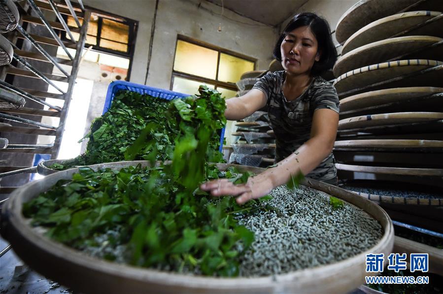 海南省瓊中黎族苗族自治縣灣嶺鎮(zhèn)灣嶺蠶繭站工作人員在喂養(yǎng)細蠶(2018年8月23日攝)。新華社記者楊冠宇攝