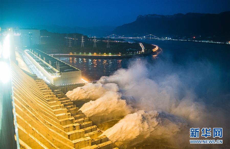 7月19日,三峽樞紐開啟泄洪深孔泄洪。19日20時,三峽水庫入庫流量4.6萬立方米/秒,較本輪洪水的峰值6.1萬立方米/秒下降了1.5萬立方米/秒?!伴L江2020年第2號洪水”平穩(wěn)通過三峽大壩。新華社記者肖藝九攝