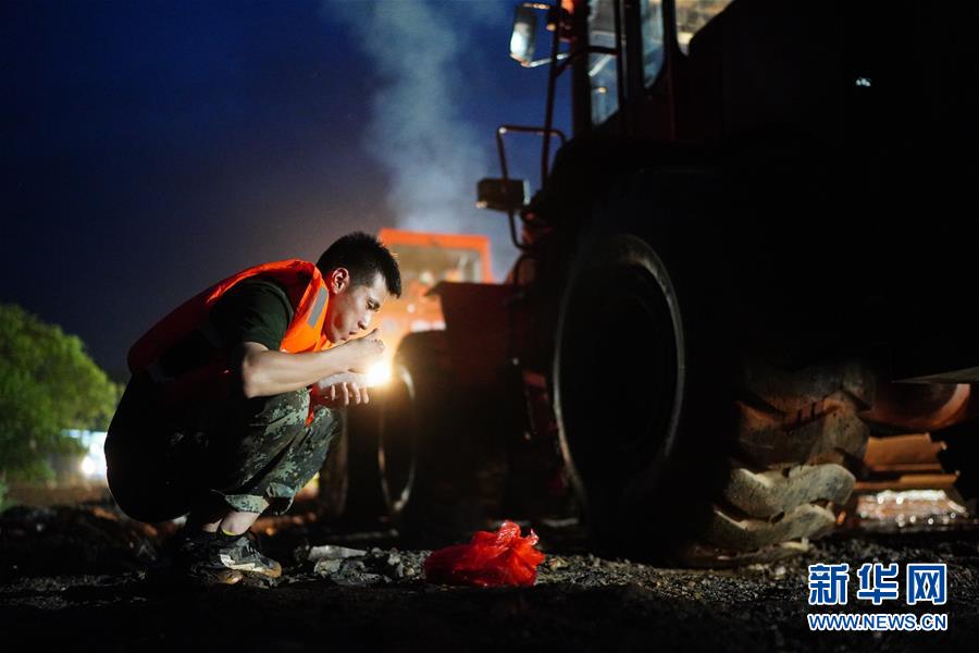 李群群在車輛旁邊的泥地上吃晚飯(7月10日攝)。來(lái)自山東的李群群是中國(guó)安能第二工程局南昌公司的一名裝載機(jī)操作手,之所以稱同事為“戰(zhàn)友”,是因?yàn)樗诘闹袊?guó)安能建設(shè)集團(tuán)轉(zhuǎn)制前是每逢搶險(xiǎn)救援都沖在一線的武警水電部隊(duì)。江西省鄱陽(yáng)縣問桂道圩堤決口后,李群群和大部隊(duì)緊急趕到封堵現(xiàn)場(chǎng)開始作業(yè)。新華社記者周密攝