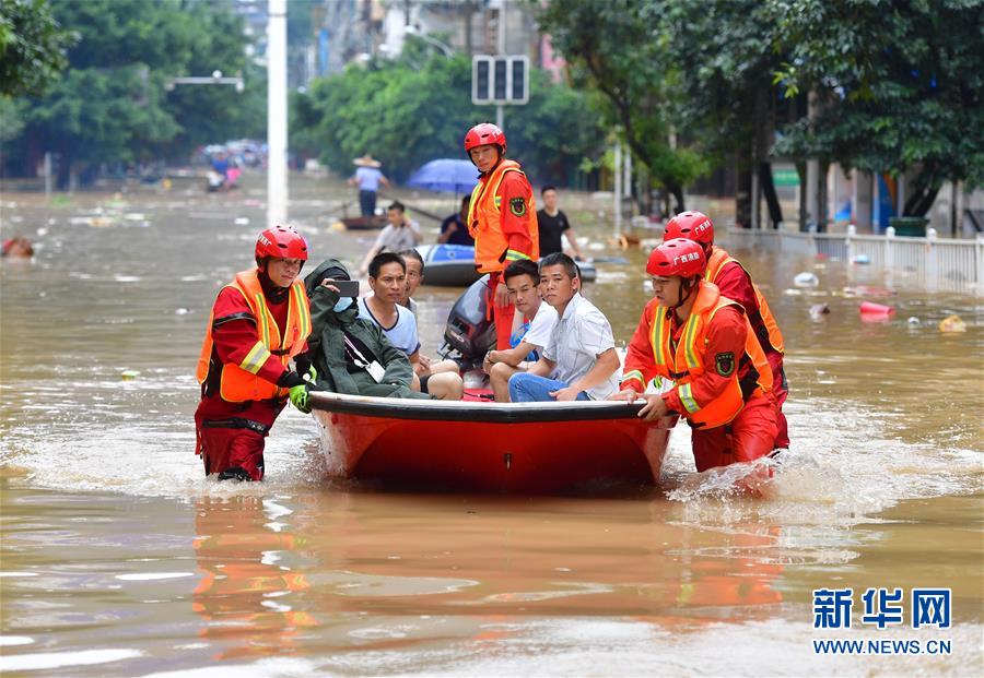 7月11日,廣西融水消防救援大隊(duì)的救援人員在轉(zhuǎn)移被困群眾。受連日強(qiáng)降雨影響,廣西柳州市融水苗族自治縣融江水位暴漲,導(dǎo)致縣城出現(xiàn)嚴(yán)重洪澇災(zāi)害。新華社記者黃孝邦攝