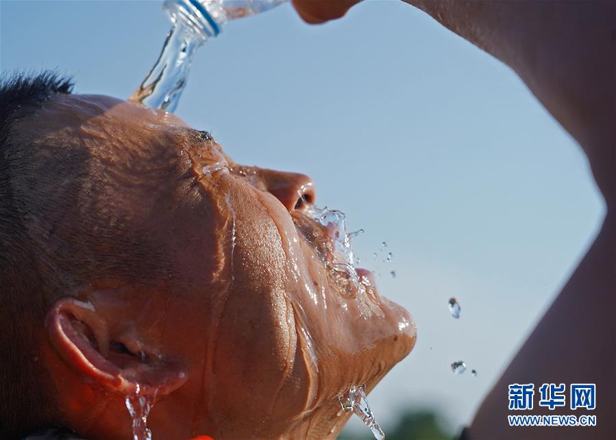 武警江西總隊(duì)上饒支隊(duì)的一名戰(zhàn)士將礦泉水倒在臉上降溫(7月14日攝)。在位于江西省余干縣古埠鎮(zhèn)的齊埠聯(lián)圩上,武警江西總隊(duì)上饒支隊(duì)的60名戰(zhàn)士頭頂烈日,揮汗如雨,在泥水中處置一處堤壩坍塌險(xiǎn)情。新華社記者萬(wàn)象攝