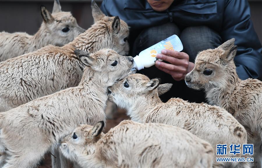 7月7日,三江源國(guó)家公園管理局長(zhǎng)江源園區(qū)可可西里管理處卓乃湖保護(hù)站的工作人員才文多杰在給藏羚羊幼仔喂奶。新華社記者薛玉斌攝