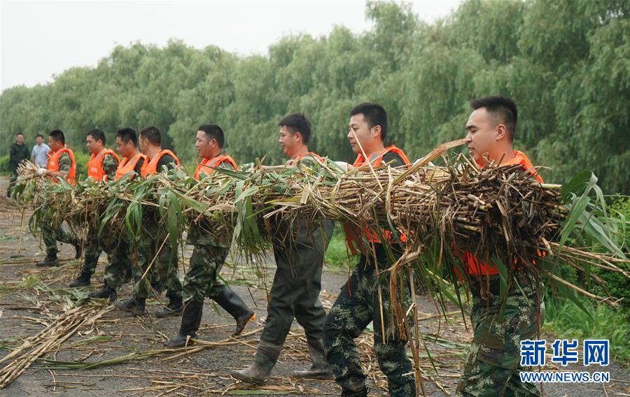 在鎮(zhèn)江市丹徒區(qū)世業(yè)鎮(zhèn)先鋒村西南大堤,中國(guó)安能集團(tuán)第二工程局常州分公司防汛前置備勤隊(duì)員準(zhǔn)備將捆好的蘆葦放在江堤邊(7月17日攝)。捆蘆葦護(hù)邊坡、機(jī)器人進(jìn)涵洞、“養(yǎng)水盆”防滲漏……在江蘇鎮(zhèn)江,當(dāng)?shù)馗刹咳罕姾蛯I(yè)力量,因地制宜就地取材,老辦法搭配新技術(shù),一批險(xiǎn)情得以消除在萌芽狀態(tài)。新華社記者季春鵬攝