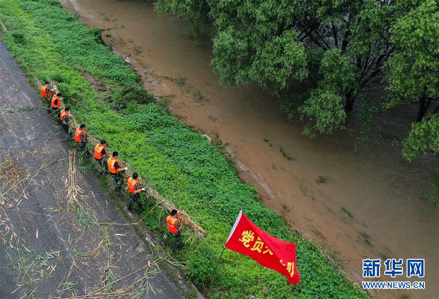在鎮(zhèn)江市丹徒區(qū)世業(yè)鎮(zhèn)先鋒村西南大堤,中國(guó)安能集團(tuán)第二工程局常州分公司防汛前置備勤隊(duì)員準(zhǔn)備將捆好的蘆葦放在江堤邊(7月17日攝,無(wú)人機(jī)照片)。捆蘆葦護(hù)邊坡、機(jī)器人進(jìn)涵洞、“養(yǎng)水盆”防滲漏……在江蘇鎮(zhèn)江,當(dāng)?shù)馗刹咳罕姾蛯I(yè)力量,因地制宜就地取材,老辦法搭配新技術(shù),一批險(xiǎn)情得以消除在萌芽狀態(tài)。新華社記者季春鵬攝