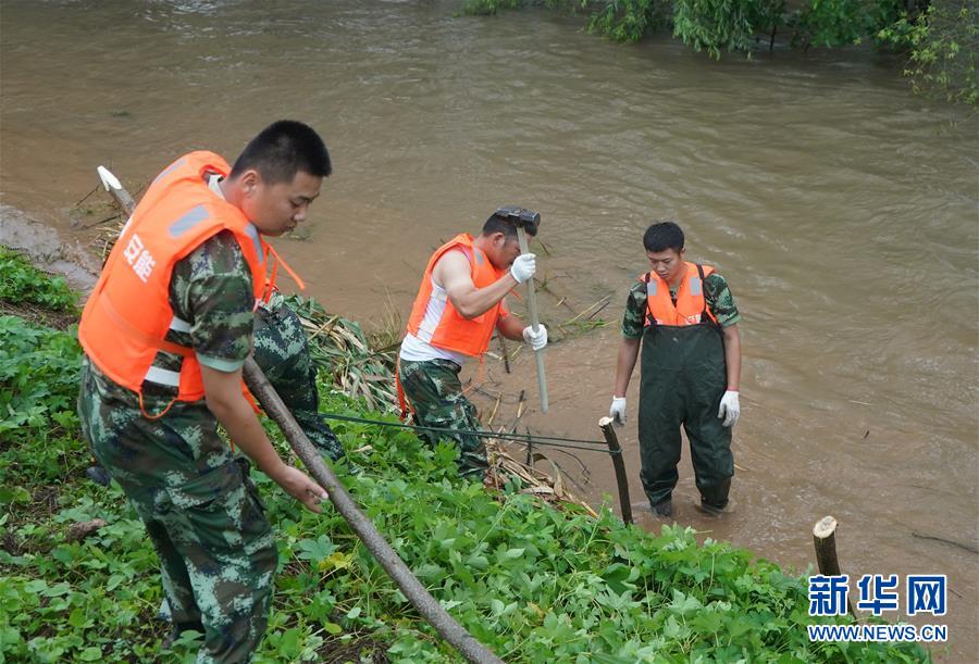 在鎮(zhèn)江市丹徒區(qū)世業(yè)鎮(zhèn)先鋒村西南大堤,中國安能集團(tuán)第二工程局常州分公司防汛前置備勤隊(duì)員在打樁,用來固定捆好的蘆葦(7月17日攝)。捆蘆葦護(hù)邊坡、機(jī)器人進(jìn)涵洞、“養(yǎng)水盆”防滲漏……在江蘇鎮(zhèn)江,當(dāng)?shù)馗刹咳罕姾蛯I(yè)力量,因地制宜就地取材,老辦法搭配新技術(shù),一批險(xiǎn)情得以消除在萌芽狀態(tài)。新華社記者季春鵬攝