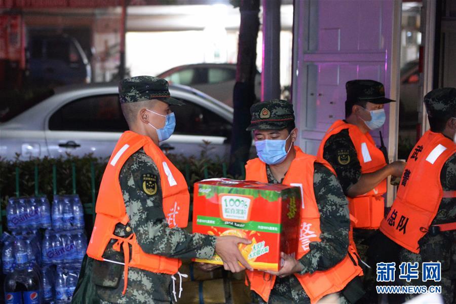 7月20日凌晨,在位于蒙洼蓄洪區(qū)內的老觀鄉(xiāng)老觀村,武警安徽總隊阜陽支隊的官兵幫助一家超市轉移貨物。新華社記者黃博涵攝