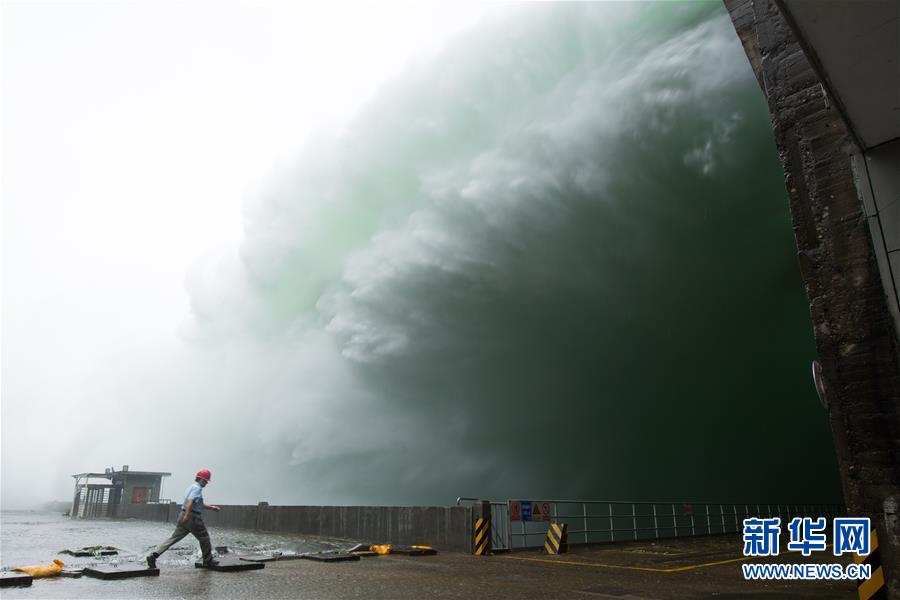 新安江電廠工作人員從正在泄洪的新安江水庫(kù)壩底經(jīng)過(guò)(7月7日攝)。新華社記者翁忻旸攝
