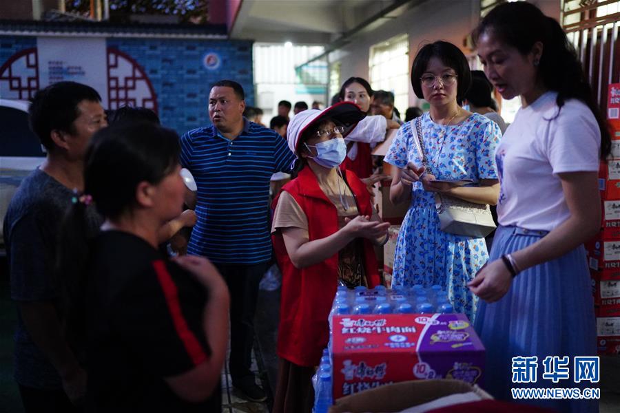 7月9日,在江西鄱陽縣鄱陽鎮(zhèn)集中安置點(diǎn),志愿者和工作人員為村民分配物資。新華社記者周密攝