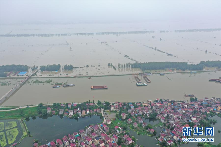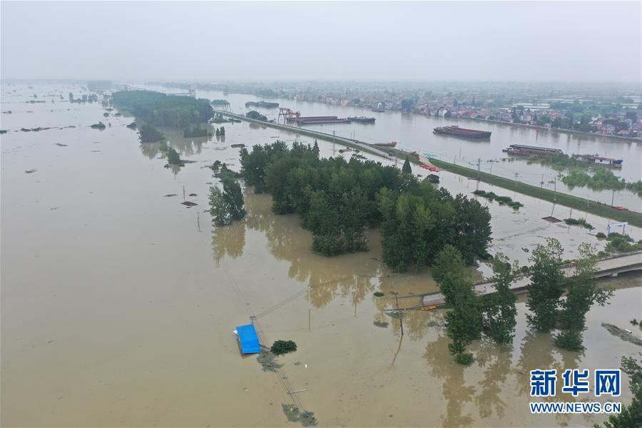 這是7月21日拍攝的被淹的南京市高淳區(qū)陽江鎮(zhèn)勝利圩(畫面左側)(無人機照片)。新華社記者季春鵬攝
