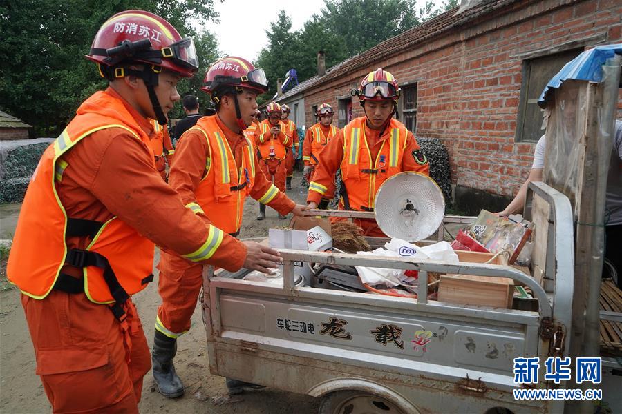 7月23日,淮安市消防救援支隊(duì)隊(duì)員在盱眙縣鮑集鎮(zhèn)新遷村幫助村民轉(zhuǎn)移車輛。當(dāng)日,受淮河盱眙段水位上漲影響,江蘇省淮安市盱眙縣啟動(dòng)鮑集圩行洪區(qū)萬余名群眾撤離轉(zhuǎn)移工作,確保安全度汛。新華社記者韓瑜慶攝