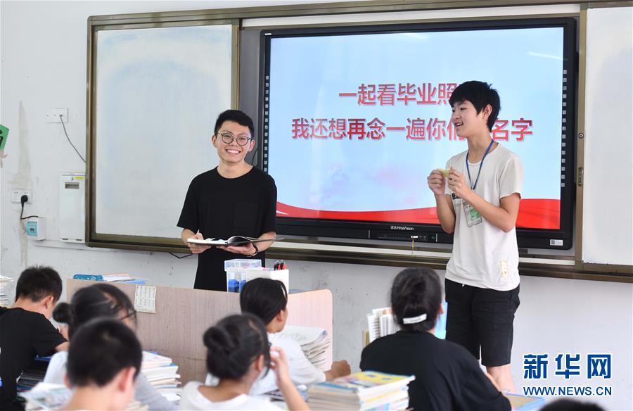 在融水苗族自治縣丹江中學(xué)1708班舉辦的送別班會(huì)上,一名學(xué)生給支教老師溫昌浩(左)送上臨別寄語(7月23日攝)。新華社記者黃孝邦攝