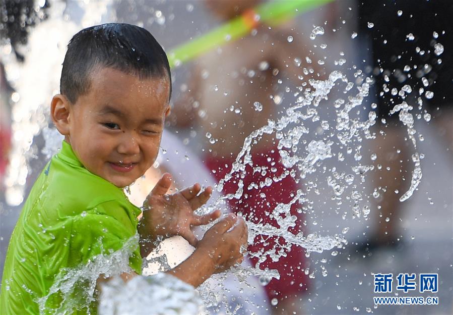 7月24日,一名小男孩在北京華熙LIVE·五棵松商業(yè)街區(qū)的一處噴泉戲水。北京市氣象局7月24日傍晚發(fā)布稱,24日截至16時30分,平原大部分地區(qū)出現(xiàn)37℃以上高溫天氣,局地氣溫超過40℃。北京市已于23日發(fā)布高溫藍色預(yù)警,預(yù)計25日全市大部分地區(qū)日最高氣溫仍將達35℃以上。新華社記者陳曄華攝