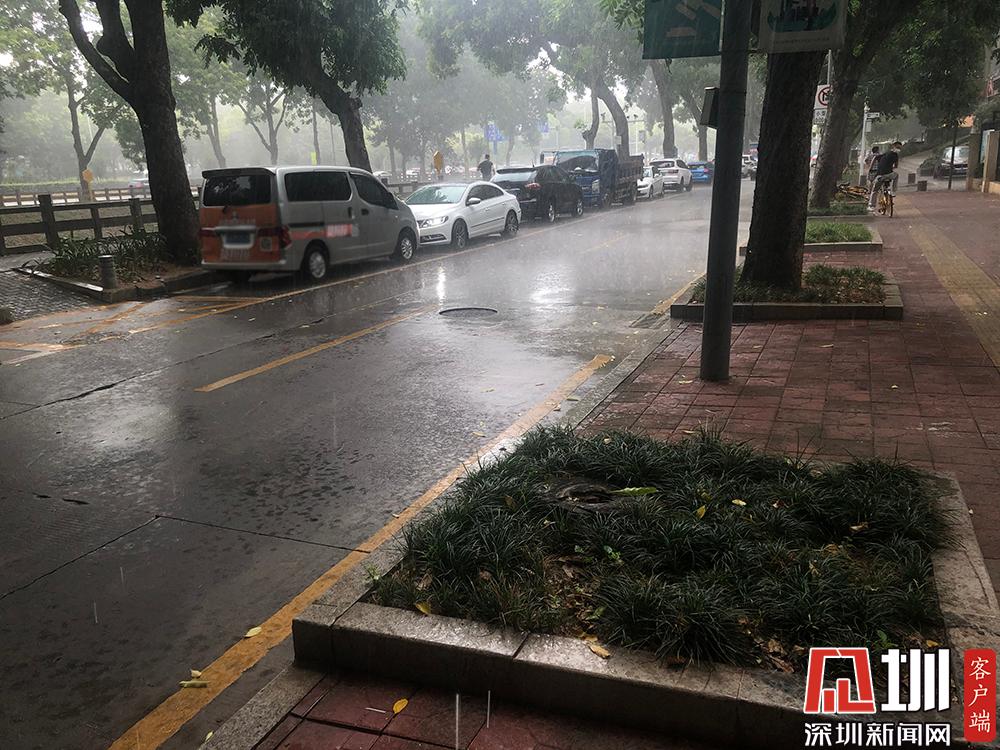 道路瞬間濕透,行人騎上共享單車迅速前往可以避雨的地方。
