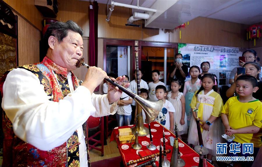 7月26日,在石家莊市橋西區(qū)休門街道休門西街社區(qū),休門吹歌傳承人付錫芬(左一)在傳授嗩吶吹奏技巧。當日,河北省石家莊市橋西區(qū)暑期“非遺”小課堂開班。河北省級非物質(zhì)文化遺產(chǎn)休門吹歌傳承人走進休門街道休門西街社區(qū),為轄區(qū)小朋友講解休門吹歌歷史,傳授非遺技藝,豐富他們的暑期生活。新華社記者 王曉 攝