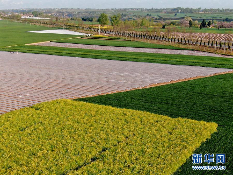 這是洛陽(yáng)市洛寧縣小界鄉(xiāng)一處油菜、西瓜、小麥間種的農(nóng)田(4月13日攝,無(wú)人機(jī)照片)。新華社記者 李安 攝
