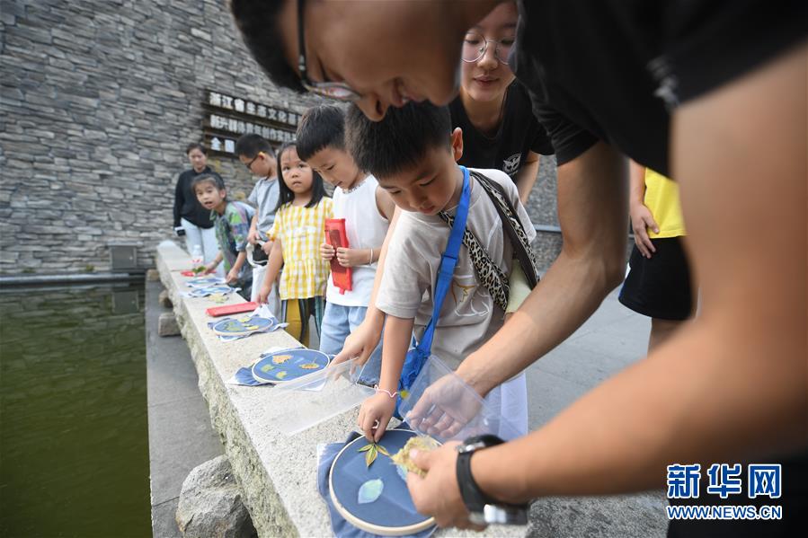 7月27日,小朋友們用樹(shù)葉制作藍(lán)染。新華社記者 翁忻旸 攝