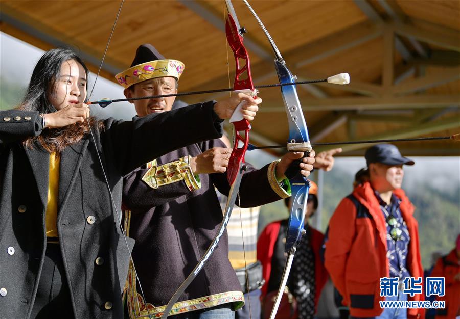一名游客在當?shù)剞r(nóng)牧民的指導(dǎo)下射擊響箭(7月26日攝)。新華社記者 張汝鋒 攝