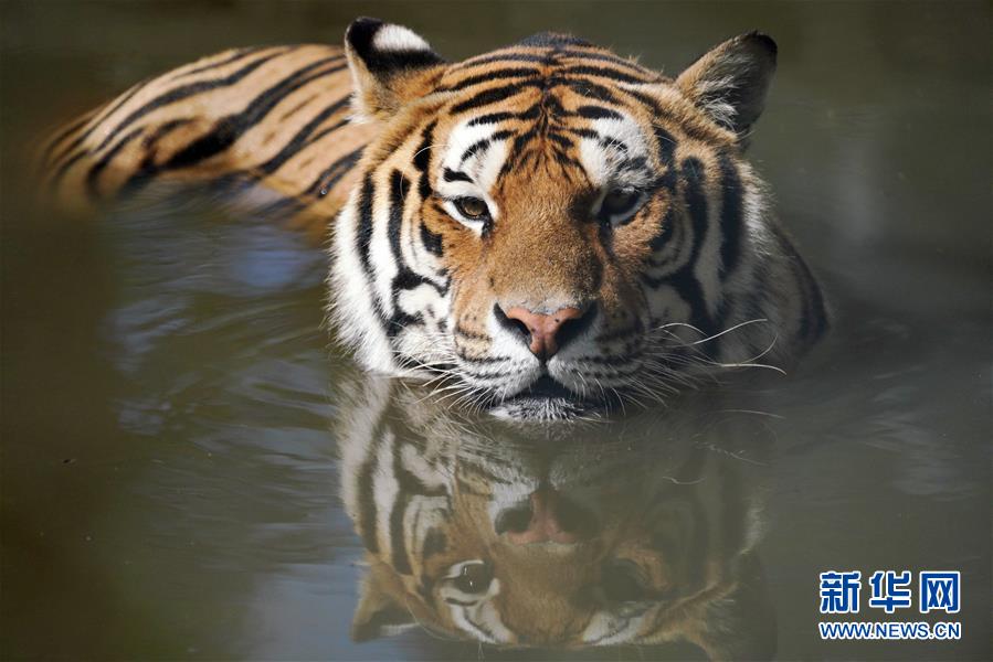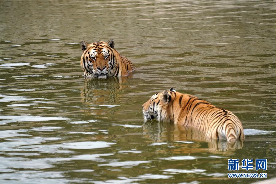 7月28日在橫道河子東北虎林園拍攝的在水中納涼的東北虎。時值盛夏,位于黑龍江省海林市的橫道河子東北虎林園的東北虎活動量減少,以不同方式消夏納涼。新華社記者王建威攝