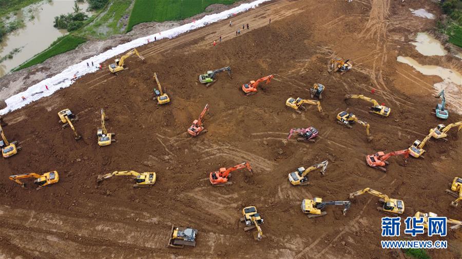7月28日,在姜唐湖蓄洪區(qū)戴家湖一處涵閘險情處置現(xiàn)場,人們操作機械設(shè)備在搶筑臨時圩堤(無人機照片)。新華社記者張端攝