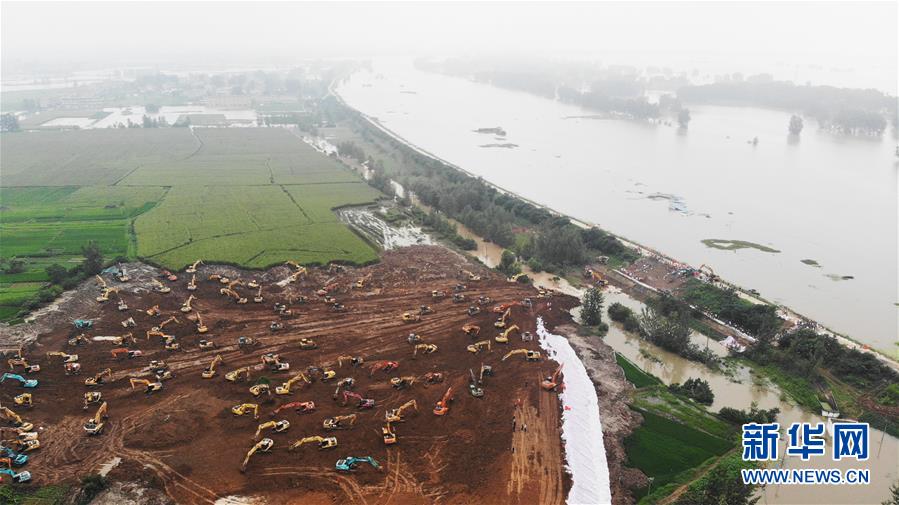 7月28日,在姜唐湖蓄洪區(qū)戴家湖一處涵閘險情處置現(xiàn)場,人們操作機械設備在搶筑臨時圩堤(無人機照片)。新華社記者黃博涵攝