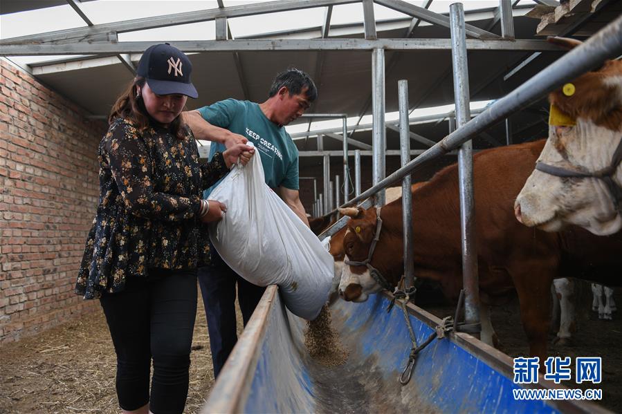 呼格吉勒(后)和妻子薩如拉在自家牛舍給母牛喂飼料(7月23日攝)。新華社記者劉磊攝