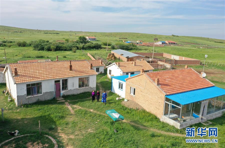 呼格吉勒和妻子薩如拉、女兒蘇日娜走在有舊土坯房和磚瓦房的自家院落里(7月23日攝,無人機(jī)照片)。新華社記者徐欽攝
