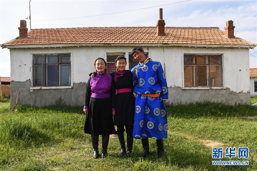 呼格吉勒(右)和妻子薩如拉(左)、女兒蘇日娜(中)在舊土坯房前合影(7月23日攝)。新華社記者劉磊攝