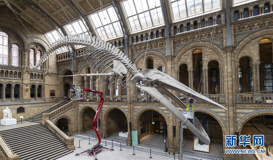 7月27日,工作人員在英國倫敦的自然歷史博物館大廳內清潔一具藍鯨骨架。受新冠疫情影響關閉數(shù)月的英國自然歷史博物館將于8月5日重新對外開放,目前館方正在為重新開放做最后準備。參觀者需要提前預約參觀時段、全程佩戴口罩且保持安全距離。新華社記者韓巖攝