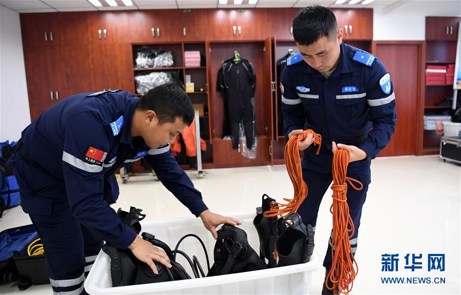 7月25日,在合肥市公安局水上分局蛙人中隊駐地,徐宏林(左)和吳正寶在整理潛水裝備。新華社記者白斌攝