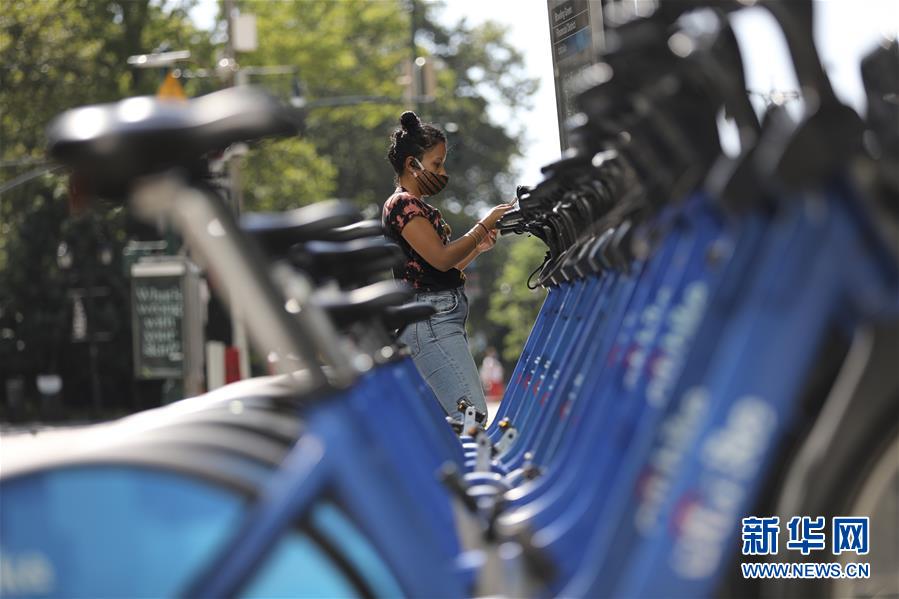 7月29日,在美國(guó)紐約,一名女子準(zhǔn)備取用共享單車。美國(guó)約翰斯·霍普金斯大學(xué)實(shí)時(shí)統(tǒng)計(jì)數(shù)據(jù)顯示,截至29日,美國(guó)累計(jì)新冠確診病例已超過440萬例,累計(jì)死亡病例超過15萬例。新華社記者王迎攝