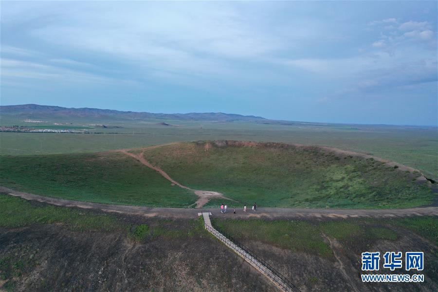 7月29日,游客在烏蘭哈達(dá)火山群的一處火山口游玩(無人機(jī)照片)。新華社記者劉磊攝