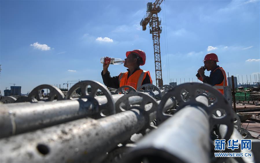 8月3日,工人在長江文創(chuàng)產(chǎn)業(yè)園項(xiàng)目工地休息喝水。進(jìn)入8月,武漢迎來持續(xù)高溫天氣。在湖北廣電傳媒基地工程的工地上,中建三局總承包公司1500多名工人持續(xù)奮戰(zhàn),力保工程進(jìn)度。該工程是我國中部地區(qū)首個(gè)國家級(jí)廣播影視媒體基地,由湖北廣電傳媒大廈項(xiàng)目、長江文創(chuàng)產(chǎn)業(yè)園項(xiàng)目、廣電生活配套項(xiàng)目三大板塊組成,總建設(shè)規(guī)模130萬平方米。自今年3月25日獲批正式復(fù)工以來,承建方克服困難,把因疫情影響耽誤的工期趕了回來,預(yù)計(jì)將按原計(jì)劃完成建設(shè)任務(wù)。新華社記者程敏攝