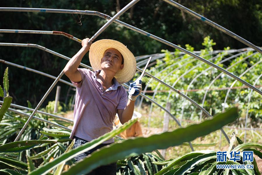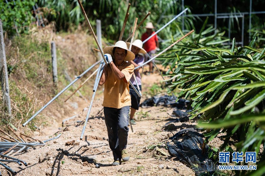 受近期多輪強降水引發(fā)的山洪影響,位于湖南省保靖縣碗米坡鎮(zhèn)首八峒村的易甸園水果有限公司種植基地大棚內上百株火龍果枝條受損,當地村民正抓緊搶修大棚,降低災害損失。新華社記者李鑫攝