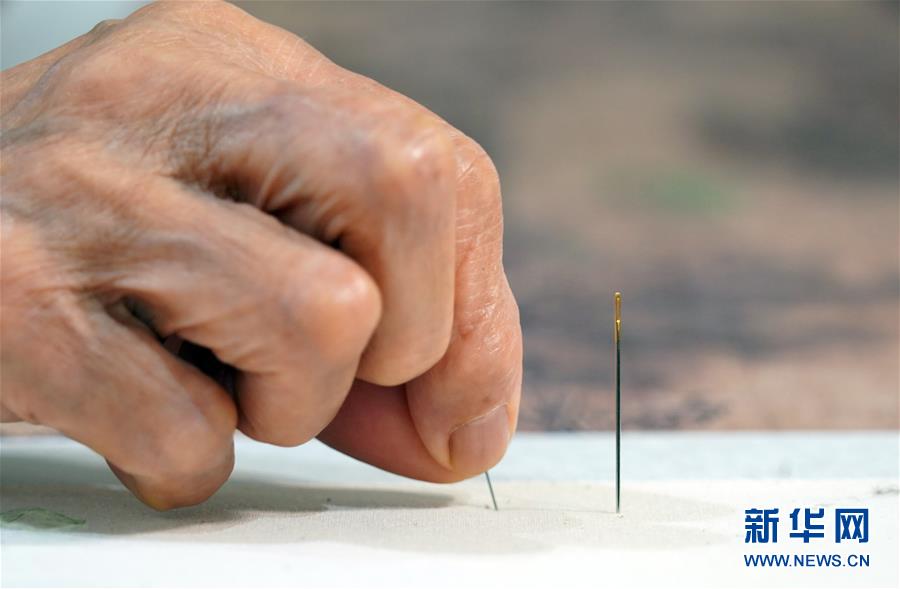 在開(kāi)封市素花宋繡工藝有限公司的展示館里,王素花在刺繡(7月30日攝)。新華社記者李嘉南攝