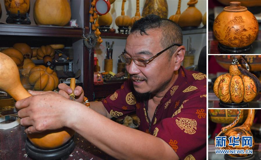 8月5日,侯景偉在葫蘆上進(jìn)行創(chuàng)作。今年55歲的吉林四平人侯景偉自幼與家人學(xué)習(xí)雕刻、烙畫藝術(shù)。經(jīng)過(guò)多年潛心研究,他將浮雕和烙畫工藝相結(jié)合,通過(guò)拋光、起稿、雕刻、烙燙、套色等十余道工藝,制作展現(xiàn)傳統(tǒng)文化、民俗故事的葫蘆工藝品。2020年,侯景偉被評(píng)為四平市非物質(zhì)文化遺產(chǎn)項(xiàng)目侯氏葫蘆雕刻烙畫代表性傳承人。他說(shuō):“希望有更多人加入到非遺傳承隊(duì)伍中,讓小葫蘆‘講’出更多民俗故事?!毙氯A社記者張楠攝