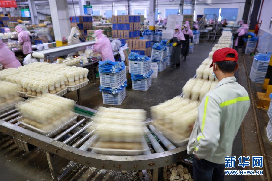8月6日,工作人員在威寧雪榕生物科技有限公司包裝金針菇。新華社記者劉續(xù)攝