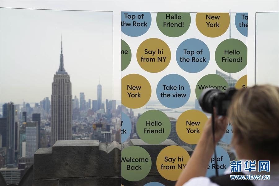 8月6日,在美國(guó)紐約,一名攝影師在洛克菲勒中心觀景臺(tái)上拍攝城市景觀。當(dāng)日,3月份暫時(shí)關(guān)閉的洛克菲勒中心觀景臺(tái)恢復(fù)對(duì)公眾開放。每天13時(shí)至21時(shí),人們可戴口罩前往參觀。新華社記者王迎攝