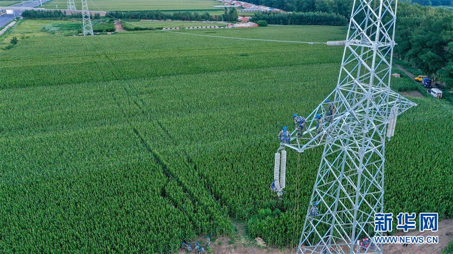 8月6日,幾名送電工在吉林省長春市城郊的一處輸電鐵塔上施工作業(yè)(無人機(jī)照片)。吉林省長春市連續(xù)多日出現(xiàn)高溫天氣,國網(wǎng)長春供電公司輸電運(yùn)檢中心的送電工們每天清晨開始作業(yè),不畏烈日“烤”驗(yàn),堅(jiān)守工作崗位,確保工程按計(jì)劃完成。新華社記者張楠攝