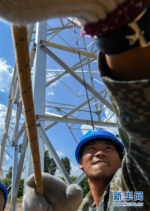 8月6日,送電工楊連才在吉林省長春市城郊的一處輸電鐵塔下施工作業(yè)。吉林省長春市連續(xù)多日出現(xiàn)高溫天氣,國網(wǎng)長春供電公司輸電運檢中心的送電工們每天清晨開始作業(yè),不畏烈日“烤”驗,堅守工作崗位,確保工程按計劃完成。新華社記者張楠攝