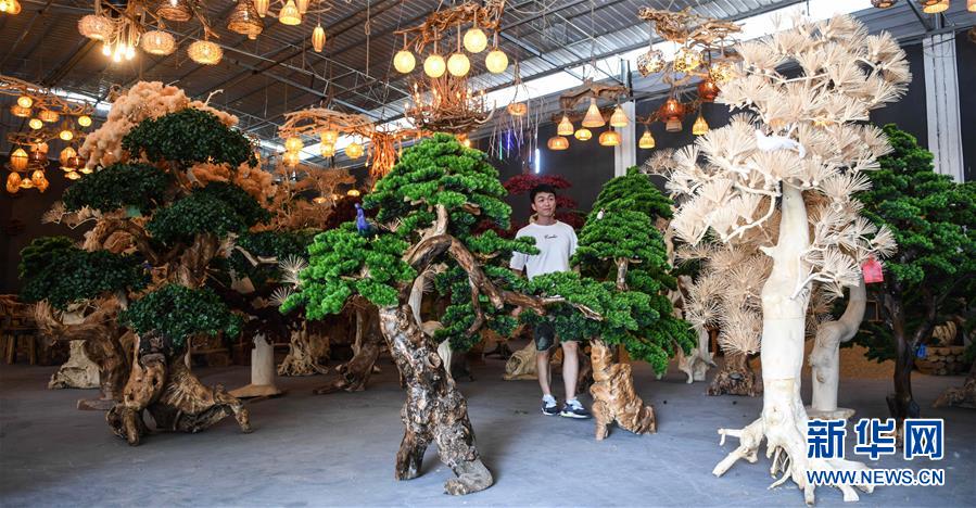 這是8月7日在永福縣永安鄉(xiāng)根雕工藝品就業(yè)扶貧車間拍攝的根雕工藝品。2017年以來,廣西桂林市永??h永安鄉(xiāng)通過幫扶返鄉(xiāng)青年創(chuàng)業(yè)的方式,建立起根雕工藝品就業(yè)扶貧車間,組織貧困群眾進車間務(wù)工學(xué)藝,把當(dāng)?shù)刎S富的朽木和柑橘樹根枝資源利用起來,加工成盆景、茶桌、吊燈等根雕工藝品,不僅幫助貧困群眾在家門口掌握一技之長,還讓他們在脫貧摘帽后實現(xiàn)穩(wěn)定增收。新華社記者張愛林攝