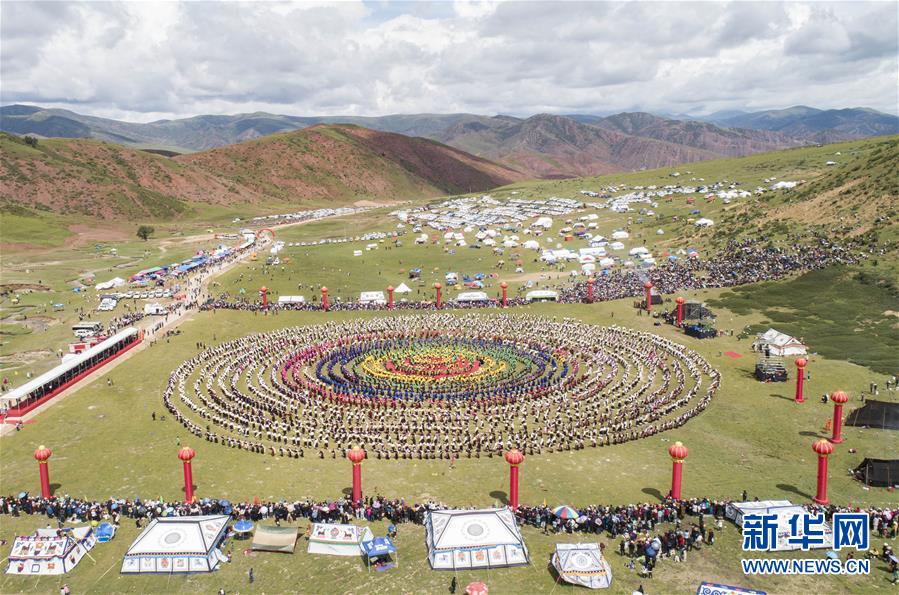 西藏首屆弦子舞展演現場(8月7日攝,無人機照片)。當日,西藏首屆弦子舞展演在昌都市芒康縣舉行。眾多演員同臺獻藝,表演國家級非物質文化遺產弦子舞,吸引西藏各地的群眾前來觀看。新華社記者孫非攝