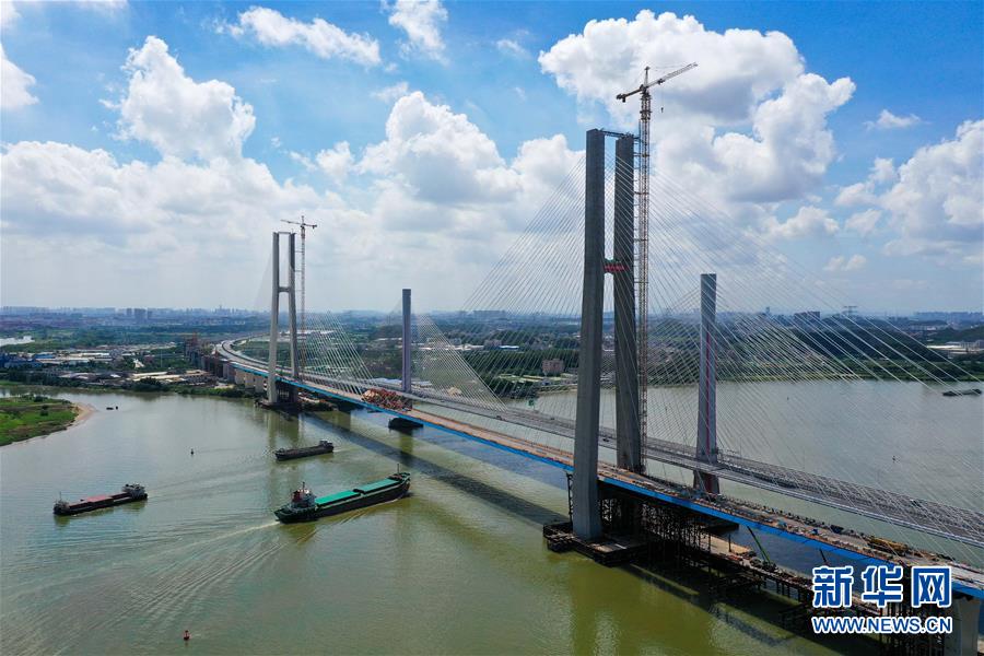 8月9日拍攝的廣州南沙港鐵路跨西江特大斜拉橋最后一塊鋼箱梁吊裝施工現(xiàn)場(無人機(jī)照片)。當(dāng)日,中鐵十一局承建的粵港澳大灣區(qū)基礎(chǔ)設(shè)施“硬聯(lián)通”重點(diǎn)工程——廣州南沙港鐵路跨西江特大斜拉橋完成最后一塊鋼箱梁吊裝作業(yè),大橋即將合龍。該橋位于廣東佛山市和江門市交界處,全長1117.5米。新華社記者劉大偉攝。