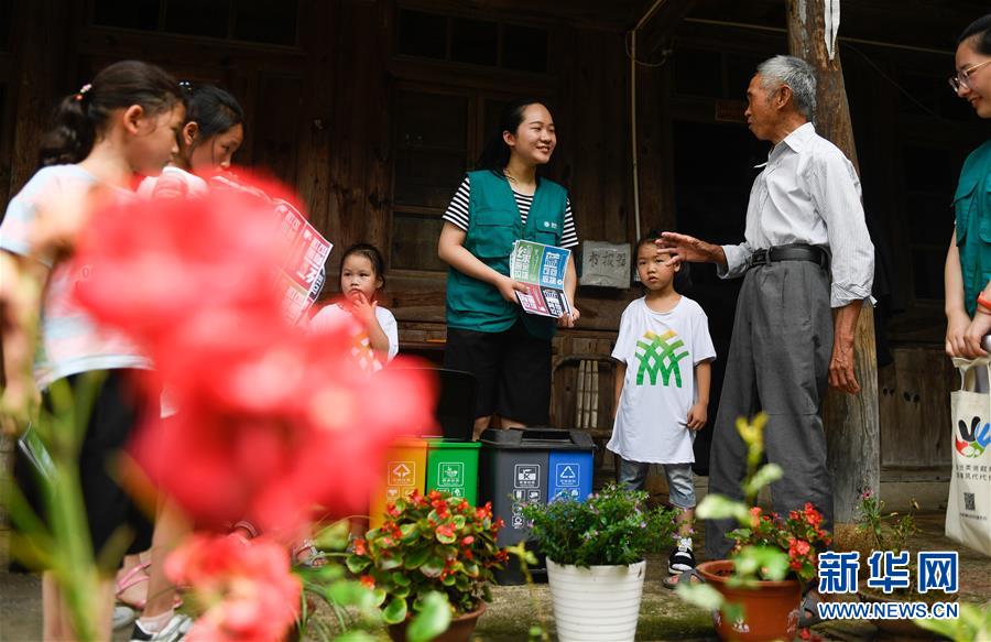 寧波市奉化區(qū)的小草志愿服務(wù)隊(duì)志愿者(中)在大堰鎮(zhèn)箭嶺村向村民和小學(xué)生講解垃圾分類的方法(2019年6月30日攝)。近年來,浙江省通過創(chuàng)新宣傳教育,多措并舉促進(jìn)垃圾分類投放、收運(yùn)及處置的良性循環(huán),引領(lǐng)垃圾分類成為城鄉(xiāng)居民的生活新風(fēng)尚。新華社記者黃宗治攝。